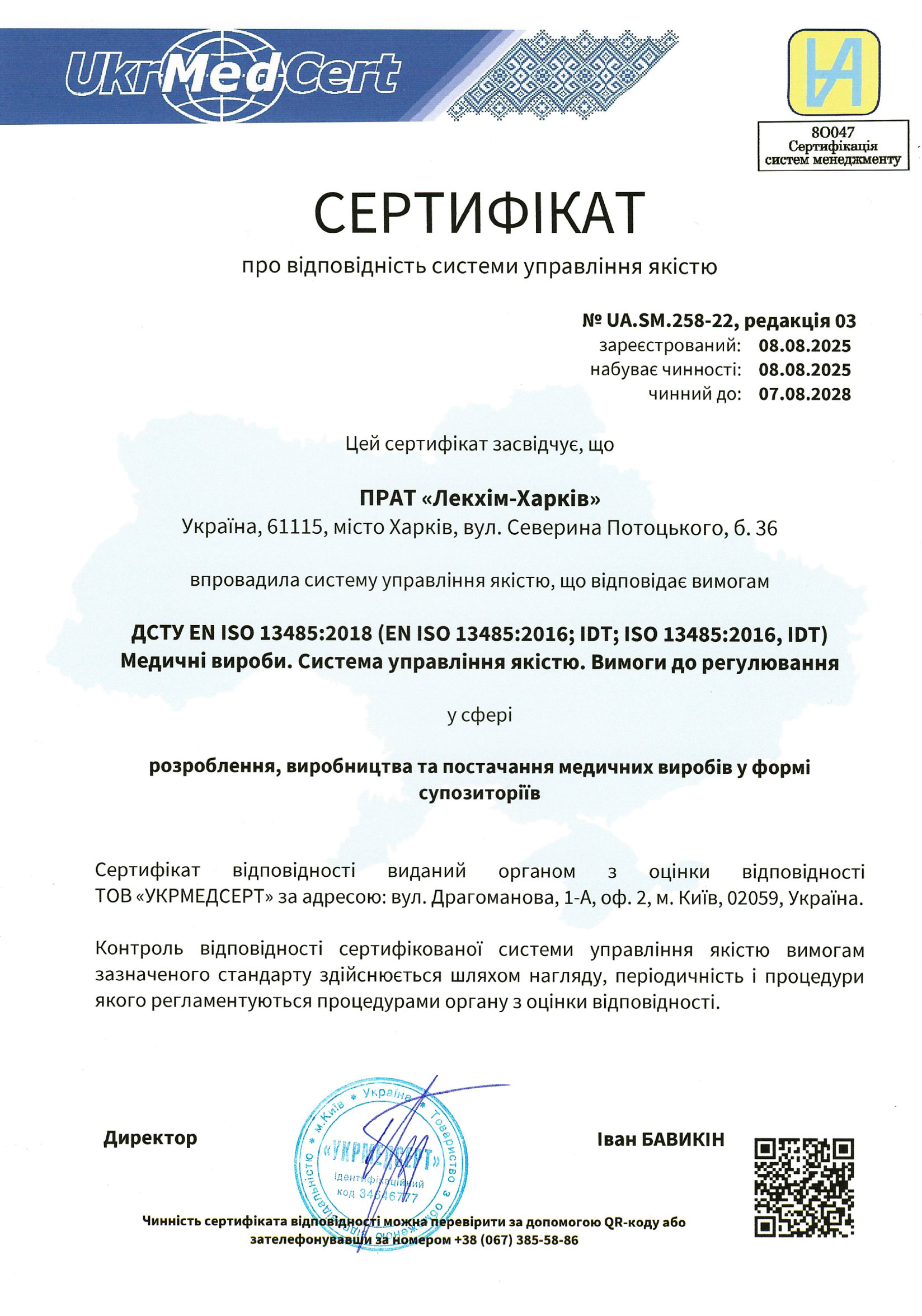 Предприятие «Лекхим-Харьков» работает в рамках системы качества и поддерживает постоянное соответствие современным европейским стандартам, что подтверждено сертификатами на соответствие требований GMP, а также сертификатами ISO .