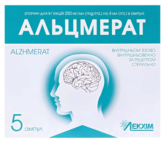 При гострих станах Альцмерат необхідно вводити внутрішньом’язово або внутрішньовенно (повільно) по 1 г (1 ампула) на добу протягом 15-20 днів. Потім, після стабілізації стану пацієнта, слід перейти на лікарську форму препарату у капсулах.