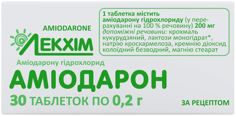 1 таблетка містить аміодарону гідрохлориду (у перерахуванні на 100 % речовину) 200 мг;