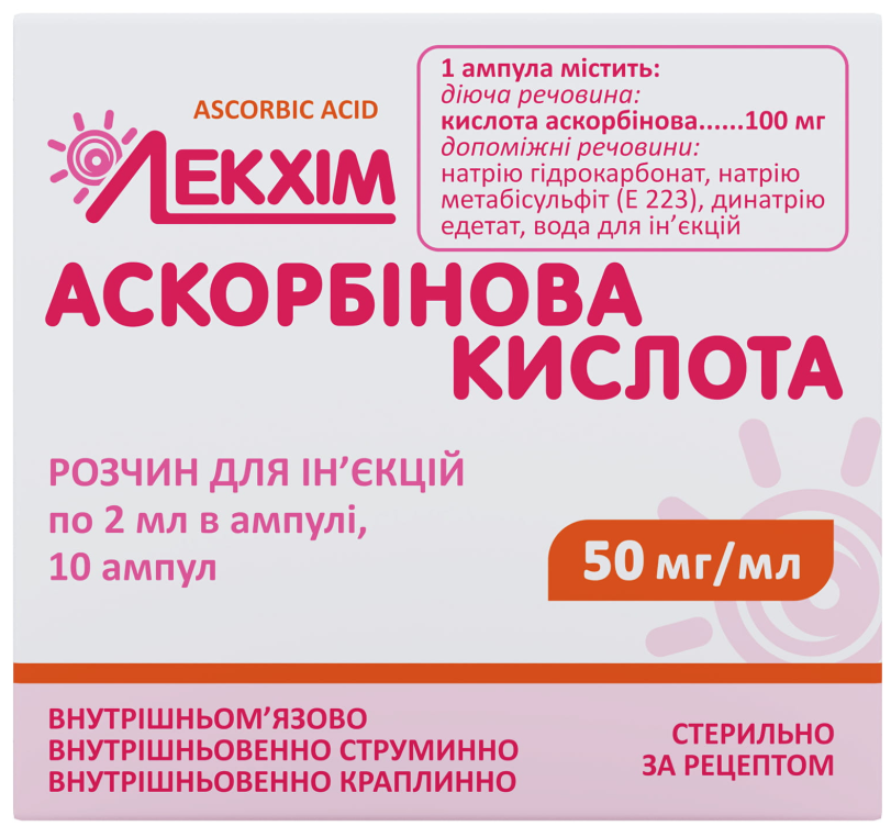 1 мл розчину містить кислоти аскорбінової 50 мг або 100 мг;