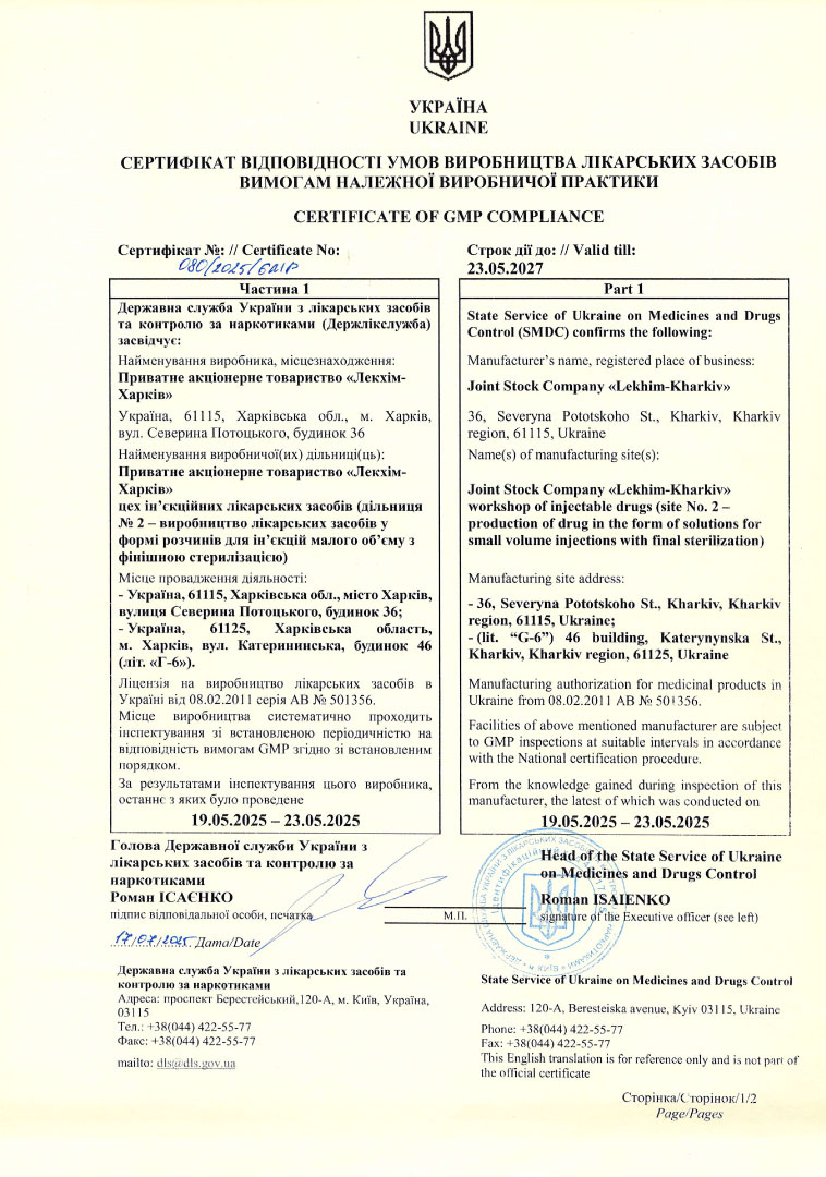 Підприємство «Лекхім-Харків» працює в рамках системи якості та підтримує постійну відповідність сучасним європейським стандартам, що підтверджено сертифікатами на відповідність вимог GMP, а також сертифікатами ISO.