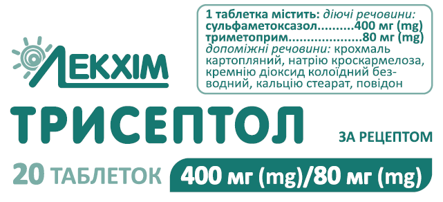 1 таблетка 100 мг/20 мг містить: сульфаметоксазолу – 100 мг, триметоприму – 20 мг;