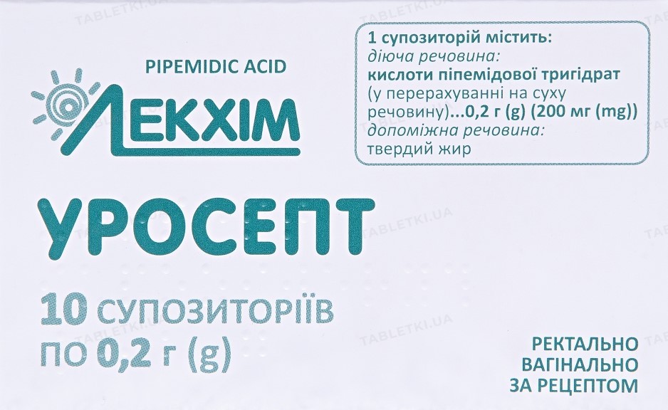 1 супозиторій містить кислоти піпемідової тригідрату у перерахуванні на суху речовину 0,2 г (200 мг);